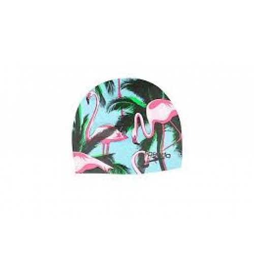 here's a tropical party happening on this whimsical swim cap, and you're invited.
